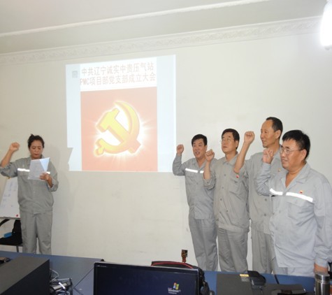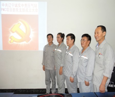 2013年7月21日遼寧誠實(shí)中貴線壓氣站PMC項目部黨支部成立大會正式召開,大會由公司黨委委員趙樹環(huán)同志主持,首先介紹了了黨支部成立的意義和目的,然后進(jìn)入了大會流程。通過全體黨員民主評議、選舉,盛孝福同志當(dāng)選為PMC項目部黨支部書記,師興華同志當(dāng)選為黨支部組織委員,胡德林同志當(dāng)選為黨支部宣傳委員,趙樹環(huán)同志代表公司黨委對黨支部成立表式祝賀。黨支部全體黨員在黨旗下進(jìn)行了鄭重宣誓,最后由黨支部書記作表態(tài)發(fā)言。