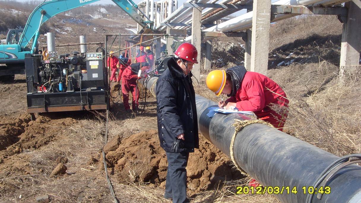 監(jiān)理人員檢查管線補(bǔ)口質(zhì)量