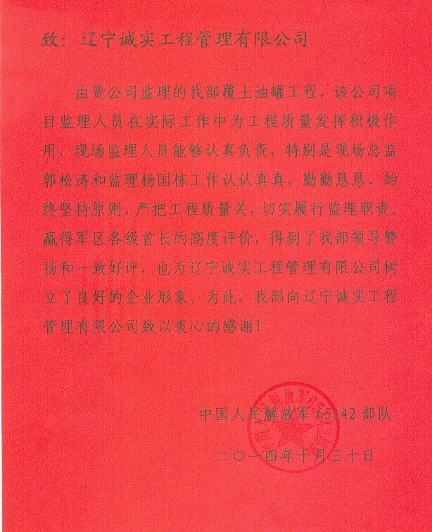 信中,中國(guó)人民解放軍65142部隊(duì)對(duì)我公司及項(xiàng)目監(jiān)理人員表示衷心的感謝。我公司項(xiàng)目監(jiān)理人員能夠認(rèn)真負(fù)責(zé)地工作,切實(shí)履行監(jiān)理職責(zé),并且對(duì)該項(xiàng)目的總監(jiān)理工程師郭松濤同志與工程師楊國(guó)棟同志提出了表?yè)P(yáng)。為此軍區(qū)各級(jí)首長(zhǎng)給予了高度評(píng)價(jià),得到了65142部隊(duì)領(lǐng)導(dǎo)的贊揚(yáng)和一致好評(píng)!